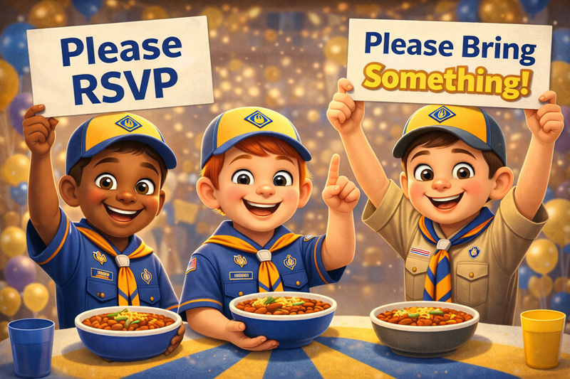 Our Blue & Gold Banquet is coming up soon, and dinner will be potluck style with a fun Chili Cook-off! If you’ve got a great chili recipe, now’s the time to show it off—please sign up and bring your best pot. Not a chili-maker? No problem—there are plenty of other options on the list (sides, desserts, toppings, and more). Thanks for helping us make this a warm, tasty, and memorable celebration!